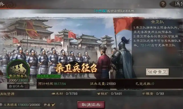 征兵是维持军队战斗力的核心环节,需要消耗粮食、木材、铁矿和石料四种基础资源。其中粮食是征兵过程中最主要的消耗品,直接影响可征士兵数量,而其他资源则用于维持征兵设施的正常运转。玩家需通过占领资源地、屯田或升级资源建筑来稳定获取这些物资,资源储备不足会导致征兵速度大幅下降甚至中断。
