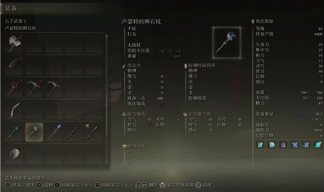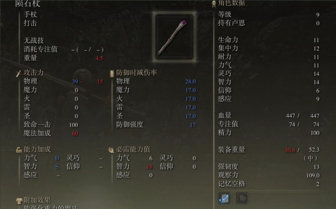 初期必须获取陨石杖和龟壳盾,前者要求18点智力且提供S级智力补正,后者需10点力量属性。中后期可根据流派选择卢瑟特杖或死王子杖,前者专注纯法术输出,后者需额外投资信仰属性。近战法师需配置名刀月隐等智力加成的近战武器,力量需求通常为12-18点。护符优先选择魔法师块护符、龙辉大盾护符等增强法术效能或生存能力的装备,记忆石需通过探索获取以扩展技能栏位。
