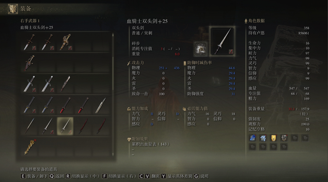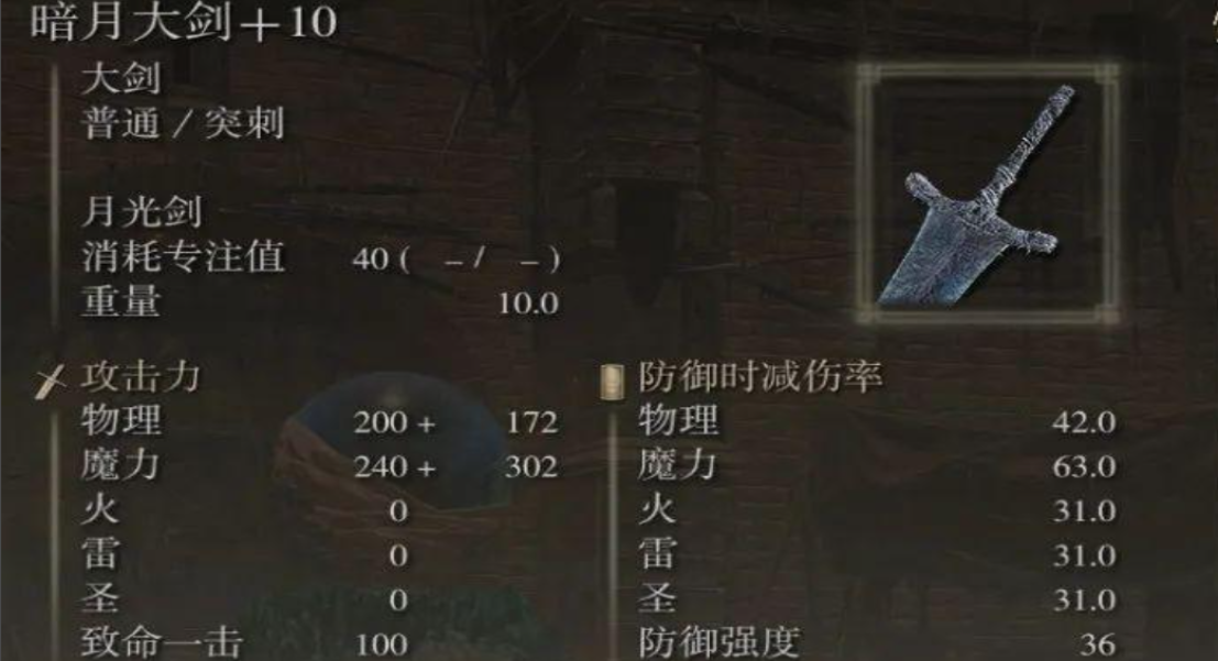 每把武器均有对应的补正等级(S至E),补正等级越高,该属性对武器加成的收益越大。强化武器会提升补正等级,因此主属性需与武器补正方向一致。战灰质变可改变武器补正类型,例如将力量补正转为敏捷补正,以适应不同流派需求。需注意,部分武器要求多重属性达标,如暗月大剑需同时满足力气与智力需求,此类武器往往需要更精细的加点规划。