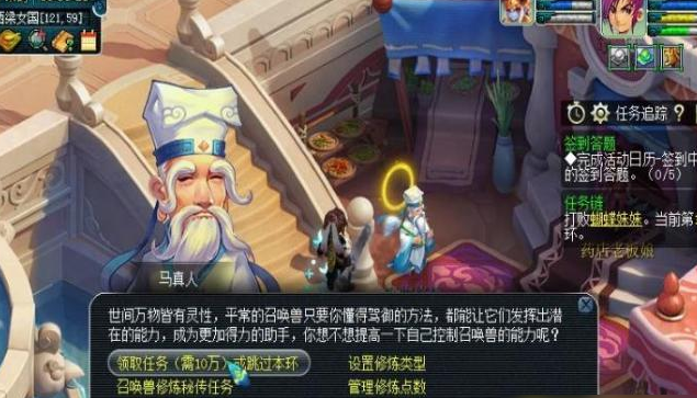 宠物修炼是提升召唤兽战斗力的核心途径之一。玩家需前往天宫(227,71)找到马真人领取修炼任务,要求角色等级≥65级,每次消耗50点体力和10万两银子。任务由100环组成,每环包含找人、寻物等类型,无时间限制但中途可跳过或取消。修炼分为物理攻击、物理防御、法术攻击和法术防御四种类型,每完成一环可获得修炼经验与积分,经验满后自动升级修炼等级,最高可提升至20级。积分达到要求时,100环完成后有概率获得高级指南书、精铁或修炼果等奖励。