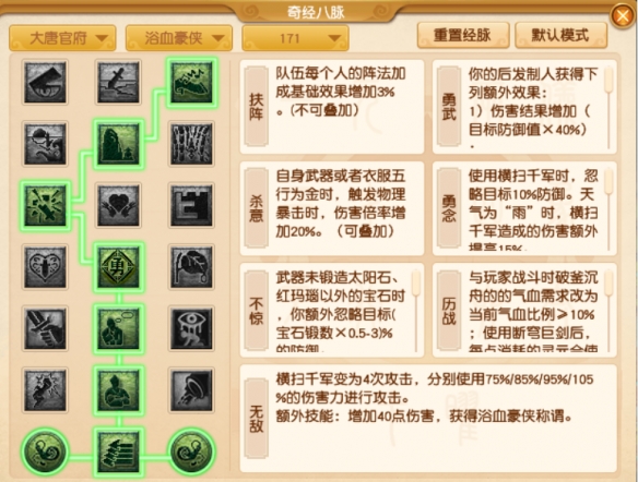 玩转大唐官府的奇经八脉,关键在于平衡输出、控制和生存能力。暴力输出流是最受欢迎的选择,适合喜欢高爆发的玩家。第一层优先点风刃,它能增加溅射攻击的目标数量,让日常任务清怪效率大幅提升。第二层选择长驱直入,忽视目标保护状态的同时还能降低对手的治疗效果,在PK中表现突出。第三层念心能提升对无召唤兽目标的暴击率,让点杀能力更强。