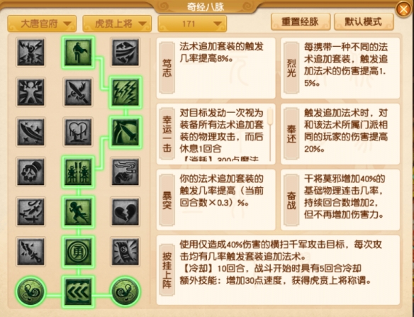虎贲上将流派是另一种有趣的选择,主打法术追加套装触发。第一层笃志能提升套装触发概率,第二层烈光适合携带多种法术套装的玩家。第三层幸运一击能根据套装数量提升伤害,第四层奉还能对同门派目标造成额外伤害。这套玩法偏向娱乐性,但成型后能打出意想不到的连击效果。