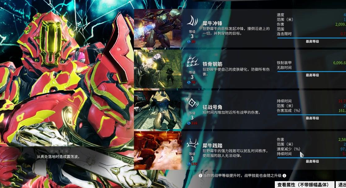 狂野犀牛(Rhino)是中期过渡的核心战甲,以高生存能力著称。2技能铁皮皮肤可提供巨额伤害吸收,3技能战吼能显著提升团队输出,4技能践踏具备强控场效果。该战甲在金星刺杀任务中即可获取部件蓝图,制作材料需求较低。犀牛适合需要承担前排压力的任务场景,MOD配置建议优先强化持续时间和技能强度,确保铁皮皮肤的覆盖率与战吼增益效果。
