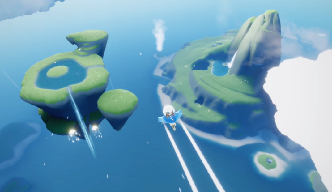 圣岛季地图的入口并非始终可见,需要玩家具备一定的飞行技巧才能抵达。从云野右侧隐藏图的正方形平台出发,需朝右前方飞行,经过一个小浮岛后继续向内深入,最终会看到圣域群岛的全貌。主岛与副岛分布明确,主岛上的大型瀑布是地图的视觉焦点,而周边散布的小型浮岛则隐藏着部分任务道具和先祖。地图中存在多处喷射气流,合理利用可大幅降低飞行消耗。