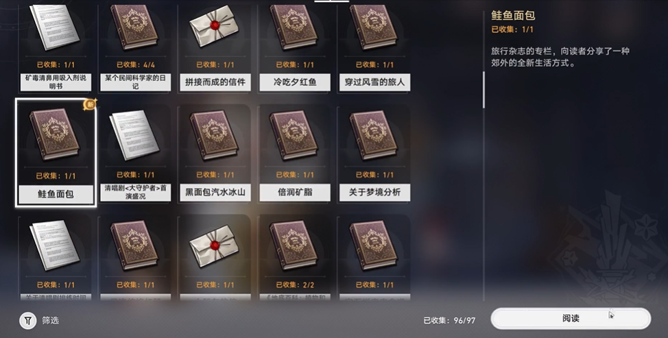鲑鱼面包的文本内容与贝洛伯格郊外的渔猎文化相关,记录了霜纹鲑的捕猎传统及特色美食霜纹鲑面包的制作方法。书籍以旅行杂志专栏的形式呈现,描述了渔猎小队在极寒环境下的捕鱼活动,并详细介绍了如何利用新鲜霜纹鲑制作面包的步骤。这类书籍不仅补充了世界观设定,也是完成全收集成就的必要条件。若玩家追求全书籍收集,需确保在修复后及时拾取,避免遗漏。