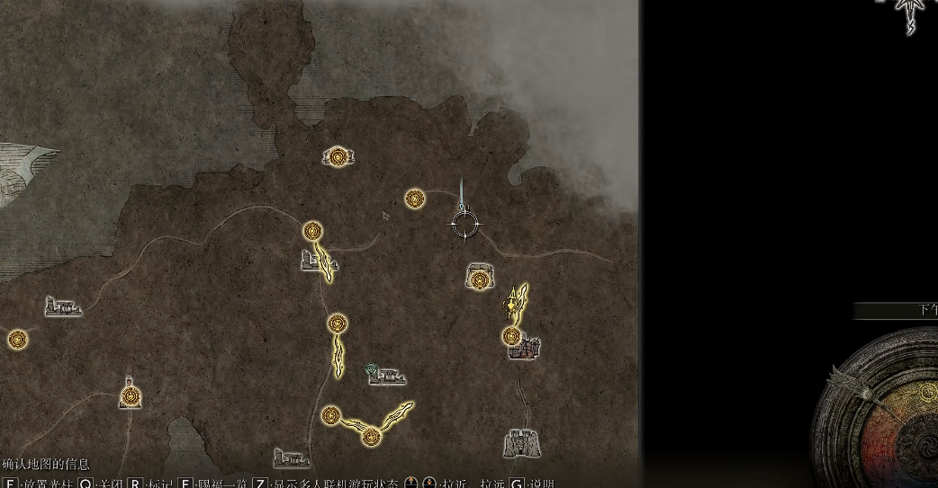 盖利德这片区域在宁姆格福东北边,开局就能去,但建议先升点级再去探索,因为这里的怪比较难缠。盖利德地图碎片在艾奥尼亚沼泽南岸西侧,具体位置是流浪民族商人旁边的石碑下,靠近就能捡到。如果没解锁地图,空白地图上也能看到主路的纹路,沿着大路走基本不会迷路。龙墓的地图碎片在更北边,从宁姆格福往东走到龙墓西方赐福点前面就能找到。
