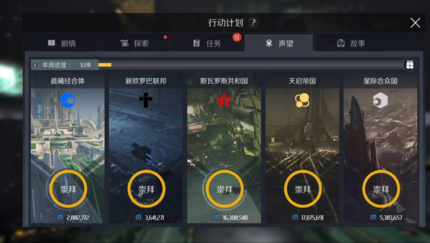 五大势力各有特色,新欧罗巴联邦和斯瓦罗斯共和国是最推荐优先刷的,因为它们的商店奖励更实用,尤其是舰船和武器蓝图,对中期发展帮助很大。晨曦经合体和天启帝国的声望虽然也能换东西,但相比之下性价比没那么高,建议后期再考虑。每周记得做完20次声望任务,搬家到对应国家的星系集中刷效率更高。