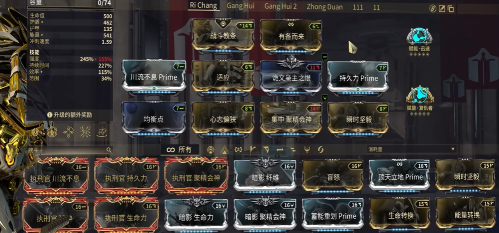 配卡方面建议优先堆强度和持续时间,强度直接影响四技能的伤害倍率,持续时间则降低能量消耗压力。核心MOD包括瞬时坚毅、聚精会神、心智偏狭等,光环卡选择战斗教条或手枪增幅。赋能推荐复仇者赋能提升暴击率,或迅速赋能增加攻速。移植技能可选消化滋养补充能量,或牛甲的站稳增强生存。副武器搭配监察者双枪等触发率高的枪械,能快速触发元素效果。