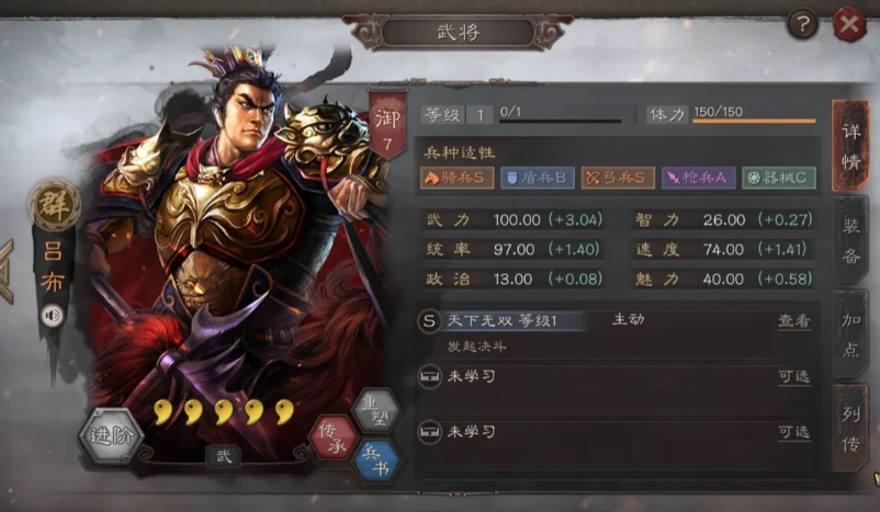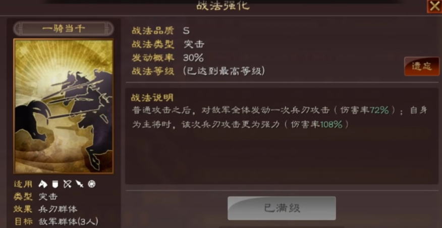 装备特技如无双是吕布专属的效果,首回合提供连击状态,相比普通战法更加稳定且没有负面效果,玩家可以通过锻造方天画戟随机获得这一特技,建议预留资源多次尝试,紫色及以上的品质装备才有概率附加特技,这些特技能在战斗准备阶段固定触发,帮助吕布快速建立优势。吕布的装备需与战法和阵容形成联动,才能最大化他的高爆发特性,标准战法搭配包括一骑当千和鬼神霆威,前者提供群体伤害而后者增强单体爆发,配合三势阵和虎豹骑等辅助战法可以提升主动战法发动率和突击效果。