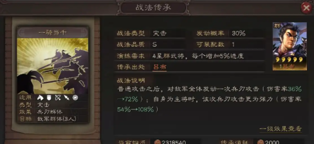 为了充分发挥吕布的输出潜力,战法搭配至关重要,通常推荐携带一骑当千、鬼神霆威、暴戾无仁等高伤害突击战法,这些技能能在决斗过程中多次激活,迅速削减敌方兵力。战法的选择需注重协同性,例如一骑当千可对全体造成兵刃伤害,而暴戾无仁则附加混乱状态增强压制效果。