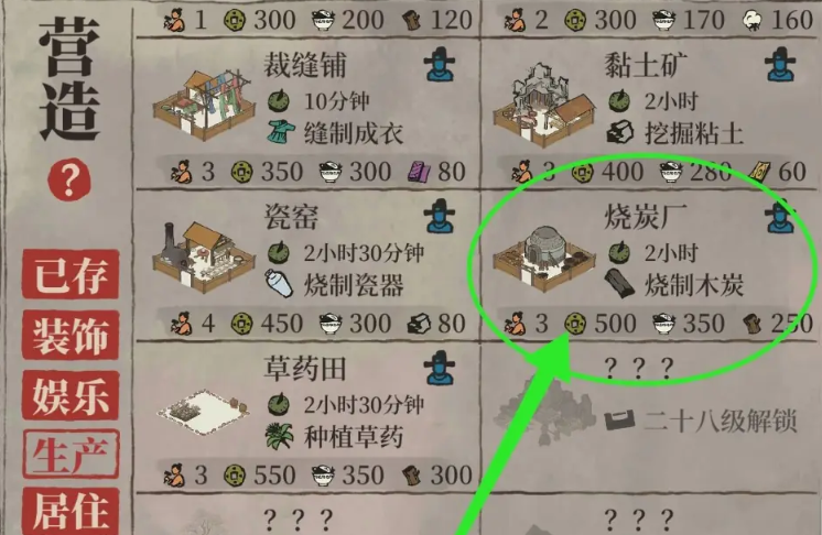 解锁烧炭厂后,玩家需要收集特定资源来建造这一设施,包括林木、菜肴、铜钱以及安排工人和特殊居民。建造烧炭厂需要消耗250单位林木、350单位菜肴、500铜钱,并且需要两名普通工人和一名特殊居民作为责任人。这些资源可以通过游戏中的其他生产建筑获取,例如林木来自伐木场,菜肴来自餐馆,而铜钱则通过商业活动积累,确保在建造前做好充分准备。