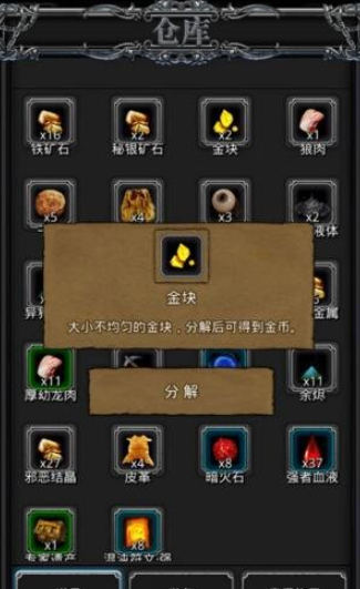 挖矿这项活动本身,其核心收益来自将挖到的金块带回庇护所进行分解。无论是小金块还是大金块,分解后都能直接转换为金币,大金块的价值尤其高,一个就能分解出两百多金币。规划挖矿活动时,队伍的配置至关重要,要优先选择力量属性高的英雄,因为整个队伍的背包容量是由全体成员的总力量决定的。出发前务必确保携带了充足的锄头,避免遇到矿点却无工具可用的尴尬,同时也要带够食物以保证续航,这样才能在一次外出中尽可能多地挖掘矿点。