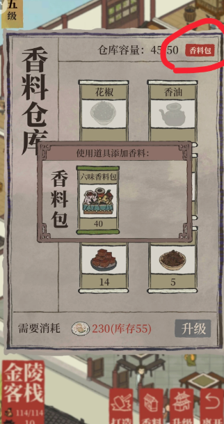 香料库房的管理也是玩法的一部分,其初始容量有限,玩家需要通过消耗空盘来扩容,或者将暂时用不掉的香料直接出售换取铜钱,这也构成了游戏中后期一个稳定的铜钱收入来源。客栈的升级并非无止境,它拥有明确的等级上限,当客栈升至最高级并完成所有菜谱后,这一玩法便趋于稳定,转变为日常的资源转换与金币产出站点。整个流程从消耗资源换取香料,到用香料做菜获得空盘,再用空盘升级设施以提升效率,形成了一个完整且自洽的资源循环体系。