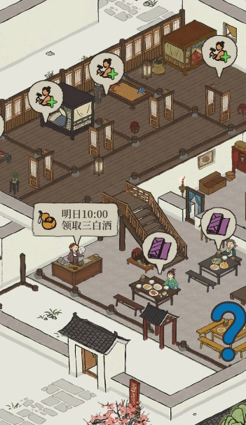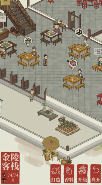 客栈是一个集资源转换、特色奖励与临时增益于一体的综合玩法建筑,它的核心玩法本质是围绕做菜展开的经营循环。玩家进入客栈后,主要交互分为几个固定区域:负责发放三白酒的老板娘、前来光顾并提出物资需求的客人、负责烹饪的大厨、储存材料的香料库房以及提供临时人力的雇佣住客。这一玩法让玩家通过消耗手中的基础资源,换取香料等特殊材料,进而制作美食,并在这一过程中获得用于升级客栈和扩展容量的关键道具好评空盘,从而解锁更高效的游戏内循环。