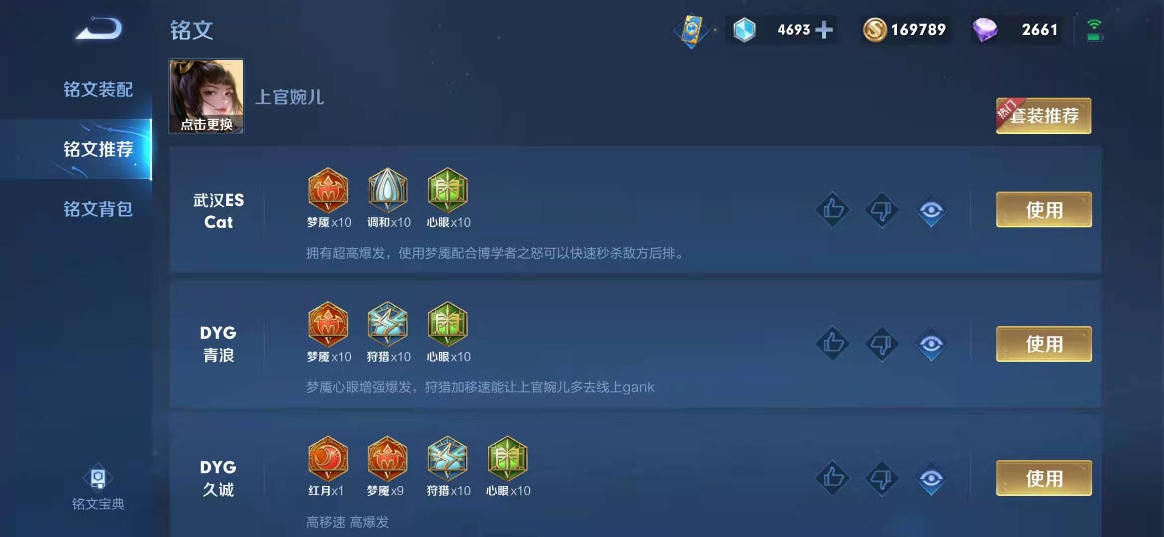 铭文搭配推荐使用10梦魇、10心眼和5狩猎5贪婪的组合。这套铭文提供法术攻击、法术穿透、攻速和移速加成,以及一定吸血效果,使上官婉儿的普攻衔接更流畅,技能输出更稳定。攻速和移速对无限连招的触发很关键,吸血属性则帮助在战斗中维持健康血量。