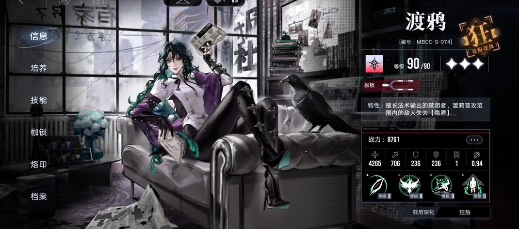 渡鸦是以狂级禁闭者身份实装的可抽取角色。她作为异能系的法术辅助,在游戏内拥有独立的卡池或作为限定UP角色登场,玩家可以通过消耗抽卡资源进行获取。她的技能组设计使其能够融入以法术伤害为核心的队伍体系,因此在规划抽卡时,若你的阵容需要法系辅助或破核手,关注当期卡池信息是获取她的关键途径。