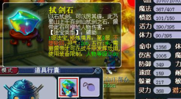 除了选择正确的法宝,你还需要注意法宝的修炼层数和五行属性,修炼可以提升法宝的效果,需要消耗经验,而好的五行属性(比如金属性的附灵玉能额外提升1%效果)也能带来额外增益,可以通过五行大师调整,法宝灵气在佩戴使用时会有消耗,平时可以在特定的场景战斗或找相关NPC进行补充。