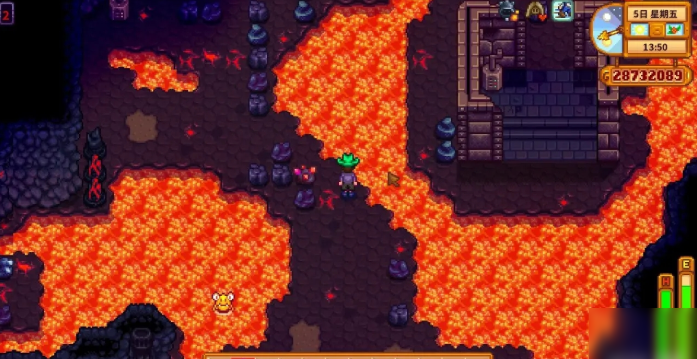 抵达火山入口后,玩家会发现道路被熔岩河流阻拦。此时需要使用喷水壶向岩浆浇水,从而制造出一条临时通行的小径。这条浇灌出来的路径仅能维持一天,次日进入时需要重新浇灌。通过这条小径后,便正式进入了火山地牢的内部。