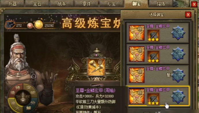 获得基础的石甲御宝后,可通过淬火与突破系统对其进行深度强化。只有紫色御宝可以进行淬火,淬火后会随机获得攻击、防御、血量等额外属性加成,从而进一步提升其防御效能。淬火与后续的突破需要消耗大量精粹,而精粹主要通过分解不再需要的低品质御宝来获得,例如分解白色御宝可得30精粹,蓝色御宝可得60精粹。将一件紫色御宝突破至最高品质,总共需要累计19000点精粹,这是一个需要长期资源规划的培养过程。