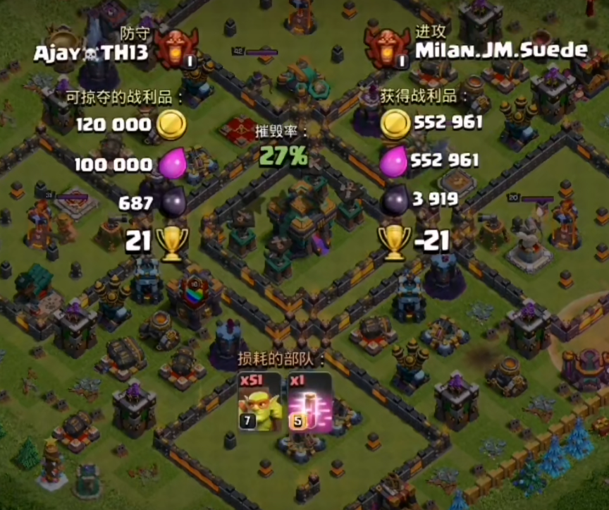 进入阵型后半段,分两路清理剩余防御,一路三王带巨人、弓箭手拆大本营与周边连弩、法师塔,另一路闰土带野猪、蓝胖清理角落防御与资源建筑。剩余黄毛分两组,一组清角落电塔,一组踩残留冰冻陷阱,避免英雄被冰冻影响输出。若有地狱塔未拆除,用圣诞奇袭法术配合闰土大招快速秒杀,防止其持续消耗英雄血量。全程保持多线操作,避免单一路线卡壳,确保推进节奏紧凑,防止时间不足导致差伤翻车。