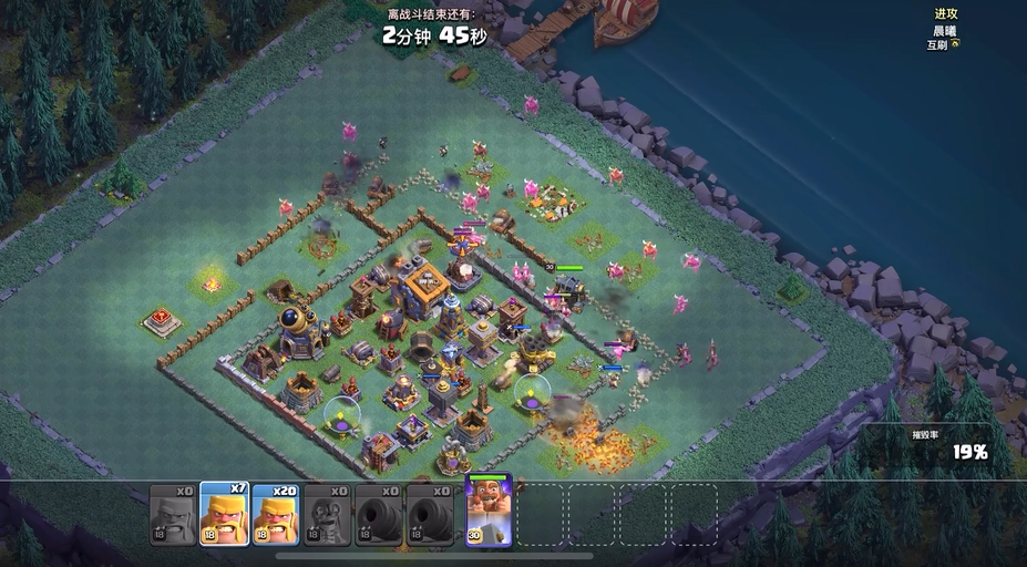 部落冲突控王的核心是通过精准下兵、断边引导、法术干预与技能时机把控,让蛮王、女王、永王、闰土等英雄沿预定路线推进,稳定处理目标建筑、规避致命伤害,同时配合大部队实现高效进攻,避免英雄走偏、暴毙或浪费输出。控王的基础是前期断边与投放位置选择,蛮王作为地面前排,通常从阵型边角投放,搭配超级野蛮人、骷髅法术或炸弹人清理边缘建筑,封锁侧方路径,防止其被外侧资源器吸引跑偏,遇到密集城墙时,可借助地震装备或战宠破墙,引导其进入核心区域,避免盲目砍墙浪费输出时间。女王多采用天女流派,搭配天