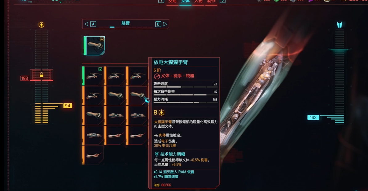 在夜之城里混,义体就是咱们的第二条命。先说武器类义体,大猩猩手臂绝对是近战流的老伙计,不仅能提升拳脚伤害,还能徒手拆炮塔、开锁,黑拳任务里更是如虎添翼。螳螂刀攻速快得像闪电,连招砍人特别爽,尤其适合喜欢贴脸输出的玩家。单分子线则是潜行党的福音,非战斗时间越久,下一击越狠,暗杀时悄无声息。射弹发射系统玩法多样,装个镇静弹就能让敌人直接躺平,适合控制战场节奏。