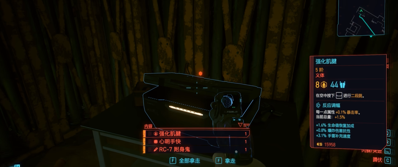 功能类义体里,强化肌腱的二段跳必须安排上,翻墙爬楼探索地图简直不要太方便。皮下护甲性价比超高,轻轻松松加护甲还不影响造型。击杀治疗和副心脏是保命神器,一个打完架回血,一个直接原地复活,冷却时间短得感人。钛金骨骼能大幅增加负重,捡垃圾党狂喜。生物导体适合装了多个冷却型义体的玩家,减少等待时间让战斗更流畅。