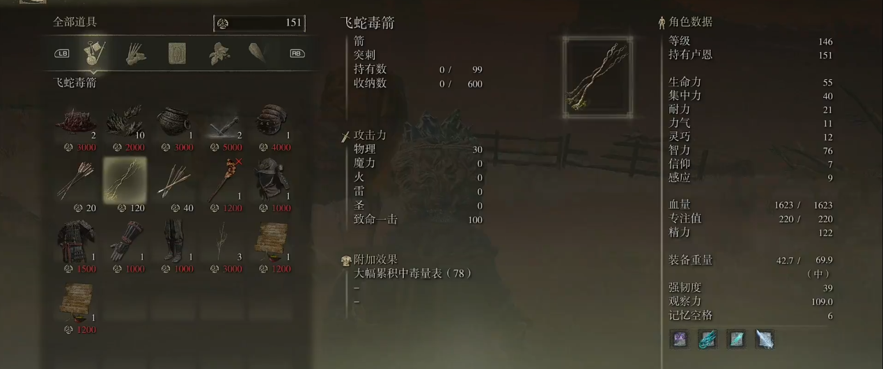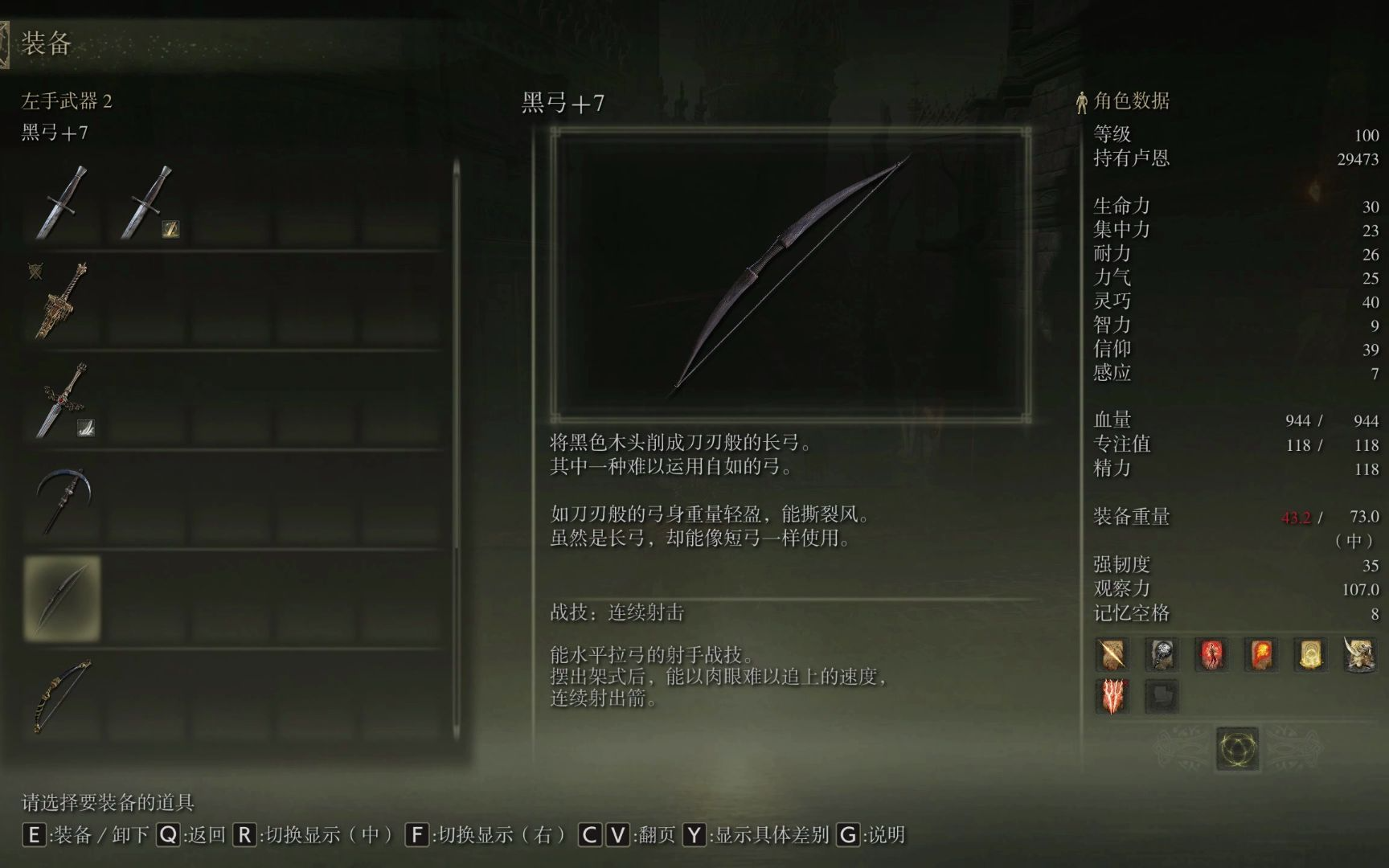 黑弓的配套玩法建议搭配护符硬箭破露滴以提升箭矢伤害,同时携带高仇恨值的骨灰吸引敌人注意力。属性加点方面,灵巧与力量均衡发展可最大化黑弓的输出效率,适当分配精力值以保证连续射击的流畅性。若追求极限爆发,可搭配拉满弓战技快速压制敌人。
