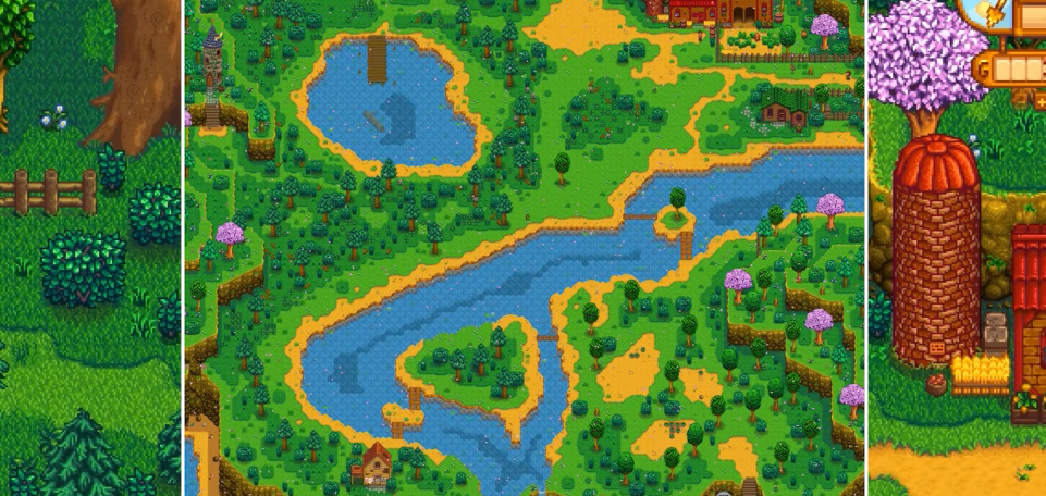 煤矿森林的地形特征十分明显,主要由大片树林和两条水域组成。森林中分布着大量可砍伐的树木,这些树木被砍伐后会自然再生,无需玩家重新种植。东南部有一片生长大葱的可耕种土地,春季时每天都会刷新野生大葱。区域内还有两条主要水体:横贯东西的河流和西北角的池塘,分别栖息着不同的鱼类品种。