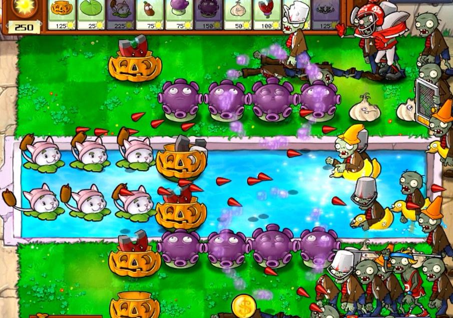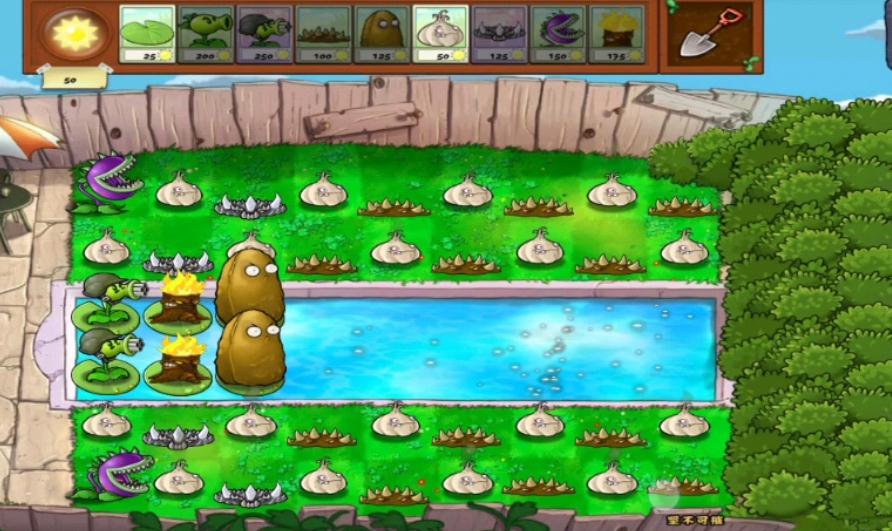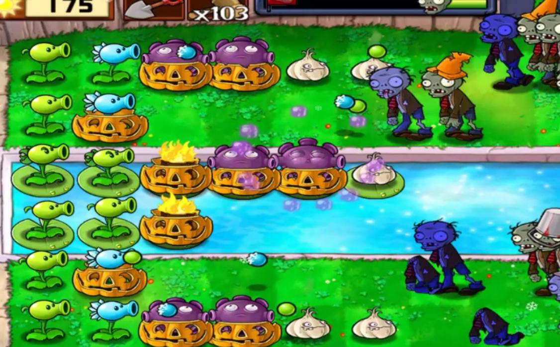 布阵时先从阳光体系搭建入手,后排优先种植双子向日葵,泳池区域铺莲叶后再种双子向日葵,确保至少四到五株双子向日葵稳定产光,阳光储备达两千以上再部署核心输出,避免前期阳光断裂导致崩盘。核心输出区集中在中排,三四列种植八株玉米投手并升级为玉米加农炮,形成八炮循环发射节奏,每间隔固定时间齐射一轮,覆盖全屏清理成群僵尸。陆地第四列与水路穿插种植冰西瓜投手,每行至少一株,利用其减速效果延缓僵尸推进,为玉米加农炮冷却与其他植物输出争取时间。前排一列种植高坚果,全部套上南瓜头形成双重防护,分散摆放防止被小丑僵尸范围爆炸摧毁,三四列边缘补种地刺王,专门克制冰车僵尸与巨人僵尸的碾压攻击,水路前三排种植忧郁菇,覆盖三线范围清理矿工僵尸与小鬼僵尸,关键植物均套南瓜头提升生存能力。