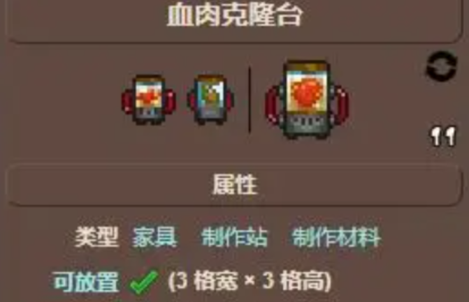 血肉克隆台是一个专门用于制作血肉主题家具的制作站,玩家可以通过它来创建各种猩红风格的装饰和功能物品。这个家具制作站在困难模式下可用,是打造独特家园的重要工具之一,帮助玩家在游戏世界中添加个性化的建筑元素。要获得血肉克隆台,玩家需要在一个生成
